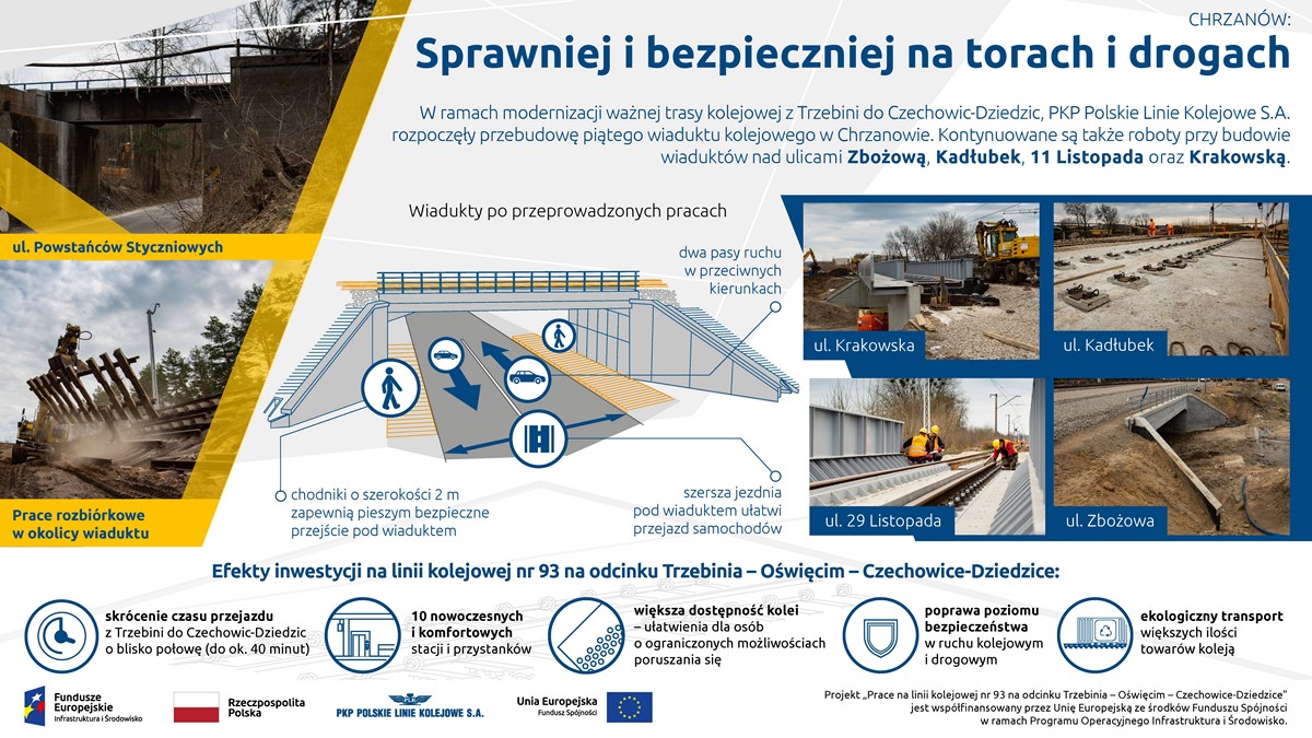 W ramach modernizacji ważnej trasy kolejowej z Trzebini do Czechowic-Dziedzic, PKP Polskie Linie Kolejowe S.A. rozpoczęły przebudowę piątego wiaduktu kolejowego w Chrzanowie. Kontynuowane są także roboty przy budowie wiaduktów nad ulicami Zbożową, Kadłubek, 11 Listopada oraz Krakowską.
